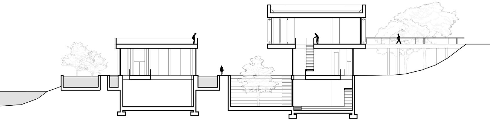 A bridge to the upper terrace of the site as well as a cantalieverd second story creates a better circulation flow and connects ground level spaces.