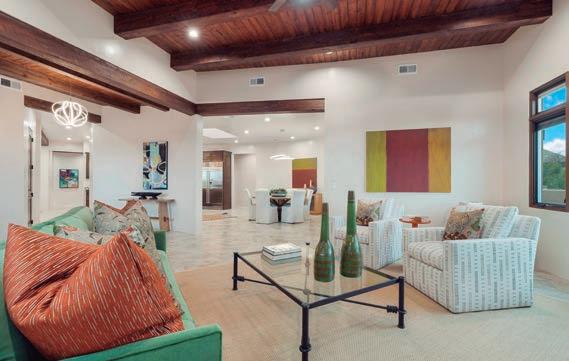 Hilltop luxury in this newly constructed home with four ensuite bedrooms, o ce, and exible gym or studio space. Chef’s kitchen with double islands, radiant heat and air conditioning, and grand Sangre de Cristo views in the gated golf community, Las Campanas.