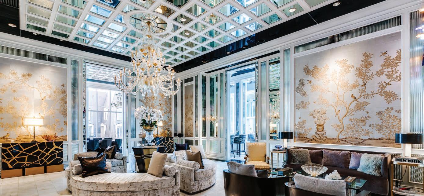 estate in Buckinghamshire, U.K., includes a console inspired by the Egyptian revival style popular in early 19th-century decor. The table is supported by a gilt sphinx, says Kravetz, while the apron has “pseudo-hieroglyphic” panels and “lotus/papyrusstyle” repeating borders. Cavetto-type moldings and a black marble base with gilding echo the stone and gold of temples.