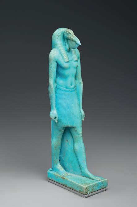 Right: “Striding Thoth”, circa 332-30 B.C., made from faience, a glazed pottery, in The Met’s “Divine Egypt” exhibition