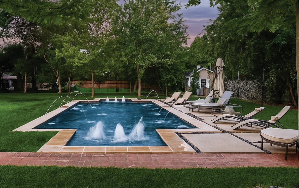 In University Park’s idyllic Caruth Hills neighborhood, this Transitional boasts five bedrooms, five full baths and two half baths across nearly 6,000 square feet. In the backyard, a covered patio with a woodburning fireplace overlooks the sparkling pool and spa.