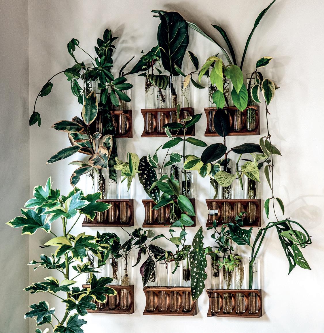 BELOW Carter’s “living wall” of plant cuttings, held in custom glass tubes in wall-mounted wooden cradles, functions as both a convenient place to propagate more plants and a conversation-starting piece of decor.