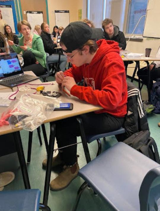 What real life application do you use when exploring Sinusoidal Functions with Math 3201 students? Ferris Wheels, of course! Students in Linda Stacey’s and Michelle Power’s classes at Holy Heart of Mary High School in St. John’s, NL worked on a maker project to take a new spin (get it?) on math learning Ms Stacey and Ms. Power jumped into their own new learning when it came to using and incorporating 3D printing and coding with the b.Boards, so that their students could have the opportunity to apply the math concept in a real-life situation. Students were tasked with coding a motor to turn their 3D printed ferris wheel which brought Bob the Lego man on a great ferris wheel ride. Students problem solved the design of their ferris wheel and their code, collected data and recorded Bob’s height above the ground (desks) for the first 15 seconds of his ride. Students then used Desmos to input their data
