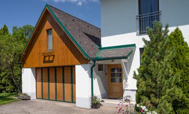 Die Dachuntersichten erhielten passend zur Fassade einen weißen Anstrich mit Lignodur FlexGuard 871, eine Dispersionlackfarbe, die höchsten UV- und Witterungsschutz mit hervorragender Oberflächenoptik verbindet. Verzugsverblendungen, Dachrinnen sowie die Rahmen der Garagentüren und das Sprossenfenster des Windfangs zur Haustür wurden im moosgrünen Farbton der Rollläden gestrichen und setzen damit wirkungsvolle optische Akzente.