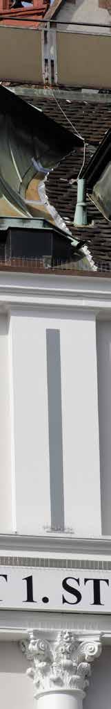 «Der Sommer war sehr heiss in Basel. Aber das Netz hat uns ein bisschen Schatten gespendet», sagt er. Im Dachbereich, wo dunklere Farben zum Einsatz kamen, wurde die Arbeit extra in die frühen Morgenstunden gelegt, um das Arbeiten in der prallen Sonne zu vermeiden. Für die Farbauswahl stimmte sich Franco Cecere mit dem Eigentümer und der Denkmalpflege ab. «Statt des vormals eher kalten Graus der Fassade haben wir jetzt ein warmes Grau, das ist schon ein sichtbarer Fortschritt», betont der Maler. Als Anstrich wurde die Sol-SilikatFassadenfarbe Ultrasil HP 1901 gewählt. Die Fensterumrandungen wurden mit Lacryl Allgrund 246 grundiert und mit der hoch wetterbeständigen Dispersionslackfarbe Lignodur FlexGuard 871 gestrichen.