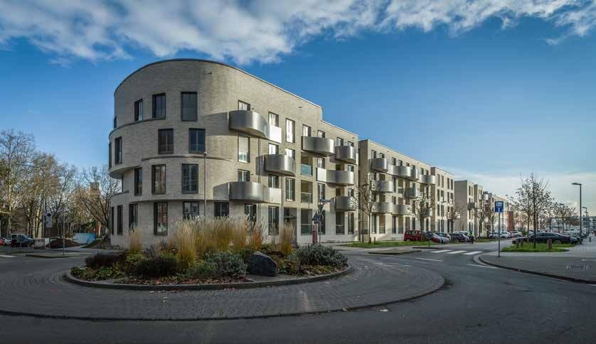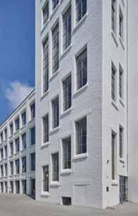 Inspiration und Impulsgeber für die ausdrucksstarke Fassadengestaltung waren historische SBahnBrücken aus Berlin und London, die in ihrer Architektur Räumlichkeiten für kleine Geschäfte bieten. Gemeinsam mit der Bauherrschaft interpretierten die Architekt/innen die dort zu findenden typischen Rundbögen neu und entschieden sich für das abgewandelte Motiv der Parabelform. In Kombination mit der Materialität entstand auf diese Weise eine authentische Architektur mit zeitgenössischem Ausdruck. Massivität trifft dabei auf Lebendigkeit, denn der langgestreckte Baukörper am Eingang des neu erschlossenen Quartiers setzt als Gebäude zum einen ein starkes und identitätsstiftendes Zeichen, vermittelt aber zum anderen dank seiner großen Fensterflächen auch Offenheit und eine gewisse Interaktion zwischen Innen und Außenwelt.