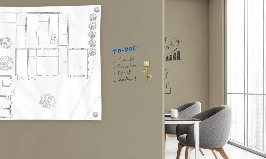 Dzięki lakierowi specjalnemu 2K-Aqua Whiteboard 2384 o wysokim połysku ściany można przekształcić w zaledwie kilku krokach w wielofunkcyjną tablicę. W połączeniu z masą szpachlową Magnofill 1859 można uzyskać dodatkową fukcję magnetyczną. Oprócz bieli możliwe jest zabarwienie lakieru 2K-Aqua Whiteboard 2384 na jasne odcienie w ramach systemu mieszalnikowego Brillux.