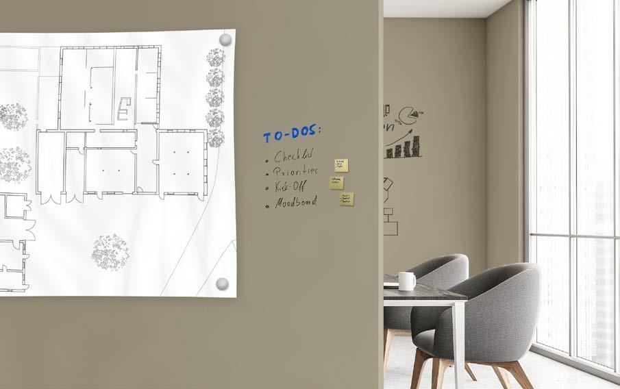 Mit dem hochglänzenden Speziallack 2K-Aqua Whiteboard 2384 verwandeln sich Wände in wenigen Schritten in multifunktionale Whiteboard-Flächen – an der sogar auch Magnete halten, wenn vorab die magnetaktive Spachtelmasse Magnofill 1859 aufgetragen wird. Neben Weiß stehen für die Gestaltung der Whiteboard-Fläche auch helle Farbtöne wie Pastelltöne zur Verfügung, die über das Brillux Farbsystem mischbar sind.