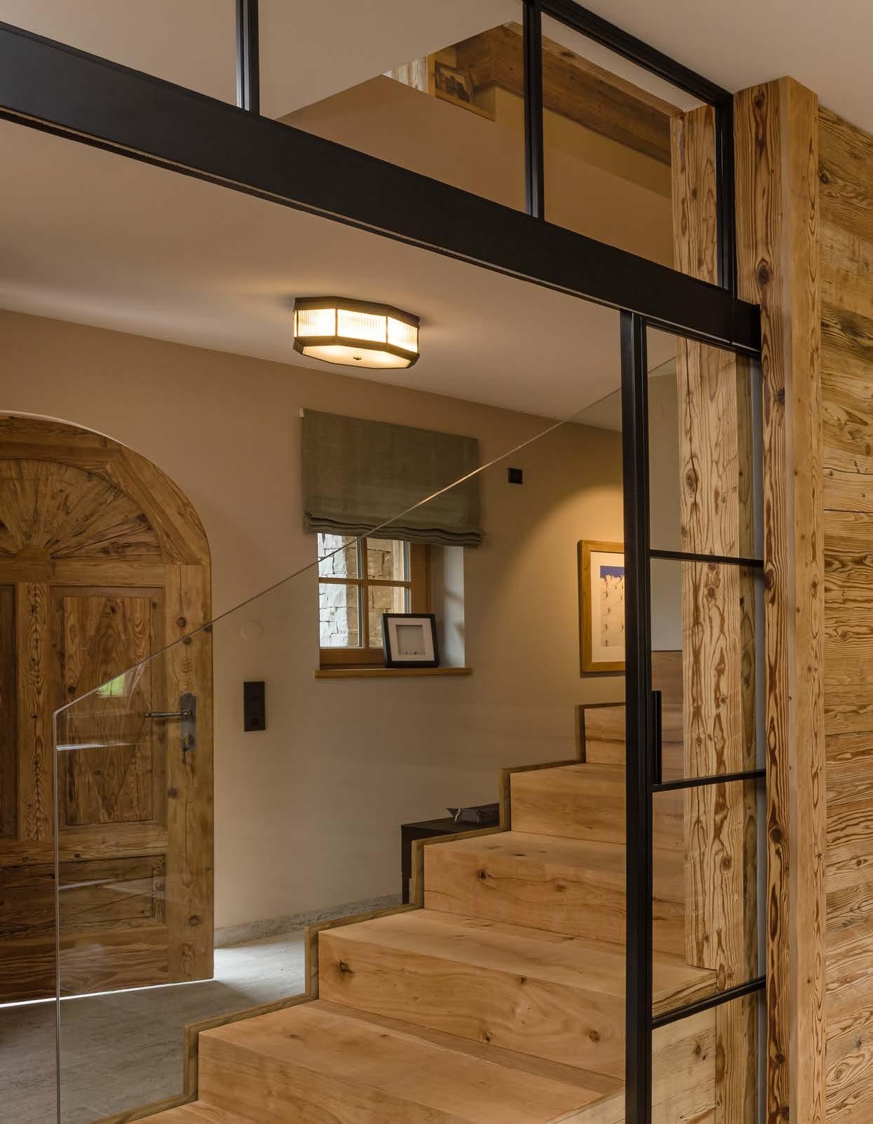 Große Fenster geben viel Licht und bringen die Materialien Holz und Stein besonders gut hervor.