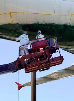 04 Detailarbeit am Rumpf: Mit Airless-Spritzsystemen und Hebebühnen lackierte das Team die Außenhaut des Airbus 02