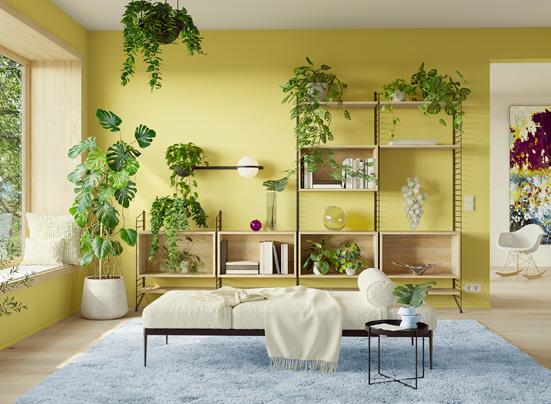 Zimmerpflanzen, helles Holz und Textilien in Feinem Kieselweiß prägen den biophilen Wohnstil. Das String-Regal verbindet Funktionalität mit Leichtigkeit, schwarze Metallakzente setzen Kontraste. Duftendes Lindgrün und Naturmaterialien wie Holz, Wolle sowie Kaschmir schaffen ein harmonisches Miteinander von Innenraum und Umwelt.