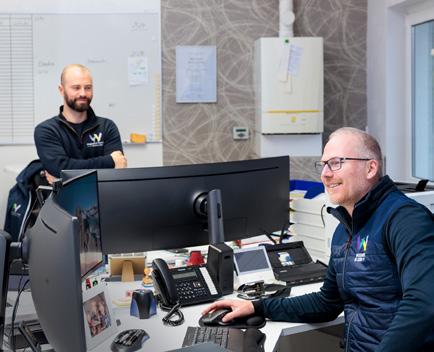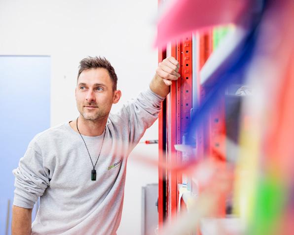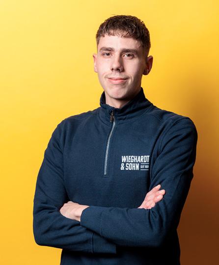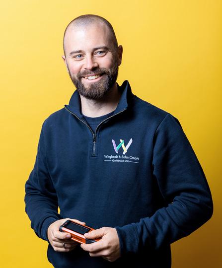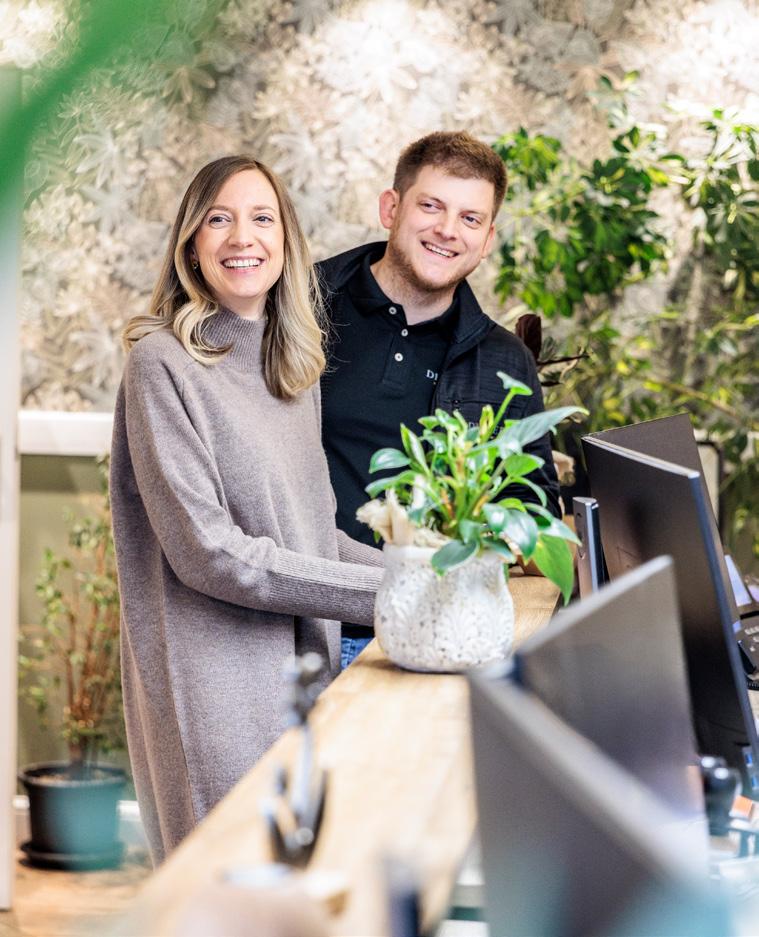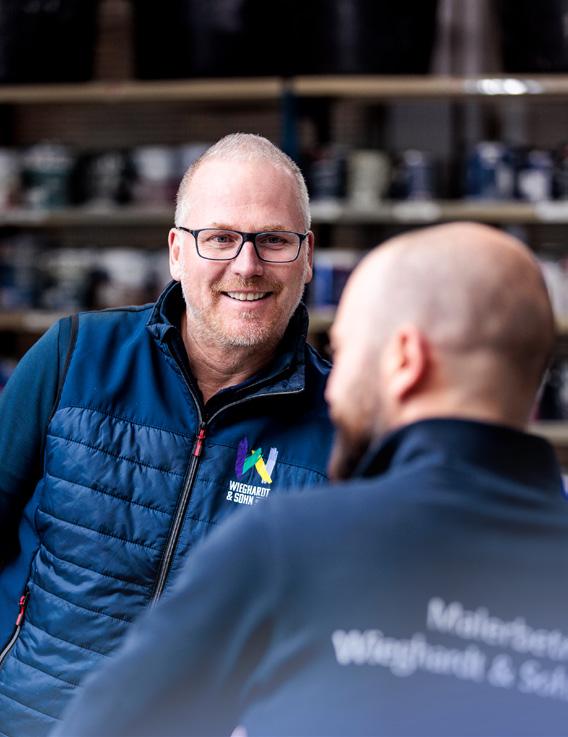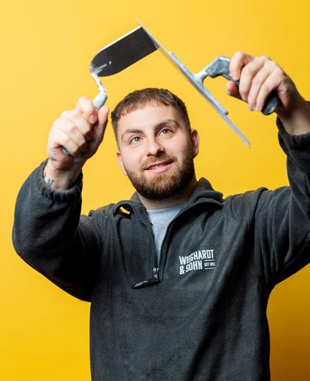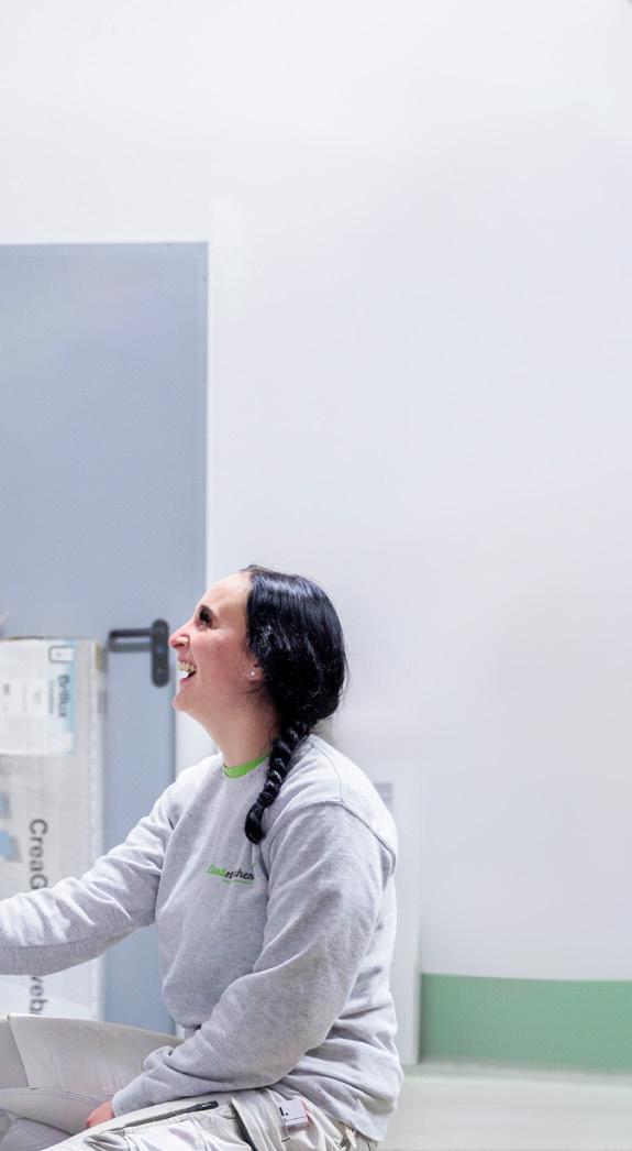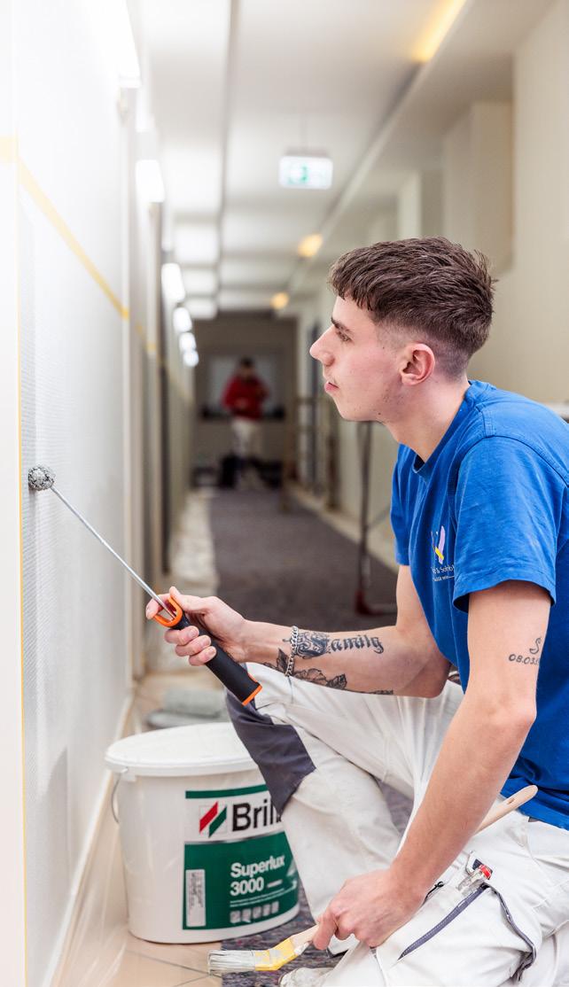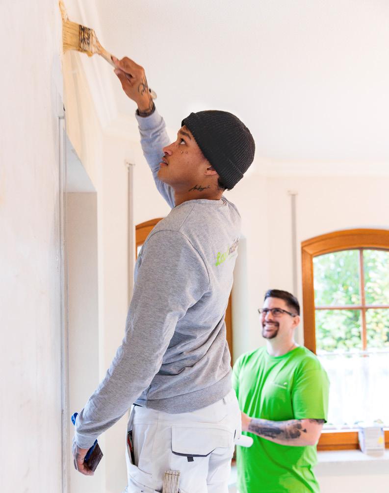 werklich begabt ist. Nur bei der Einstellung haperte es anfangs noch. „Er hat während seiner Ausbildung aber deutlich an Reife gewonnen, und deshalb konnte ich ihm immer mehr Verantwortung übertragen“, lobt Fabian Bach seinen jungen Kollegen. Wenig später brechen die Handwerker/-innen wieder auf zu ihren Baustellen und die Geschwister Annika und Oliver Link kehren zurück an ihre Schreibtische. In den kommenden Tagen ziehen die beiden innerhalb des Gebäudes um. Im neuen Büro kleben die farbenfrohen Mustertapeten schon an den Wänden. Die Geschwister Link haben den neuen Raum nach ihren Ideen gestaltet. Die Umsetzung lag in den Händen einer Fachfrau aus dem eigenen Haus: der Auszubildenden Dana Müller.
