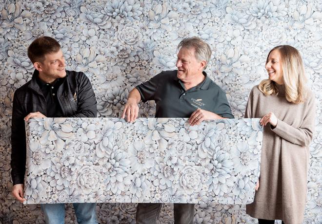 01 Sag’s mit Blumen: Seniorchef Christof Link (Mitte) entrollt mit seinen Kindern Annika und Oliver die Tapeten fürs neue Büro