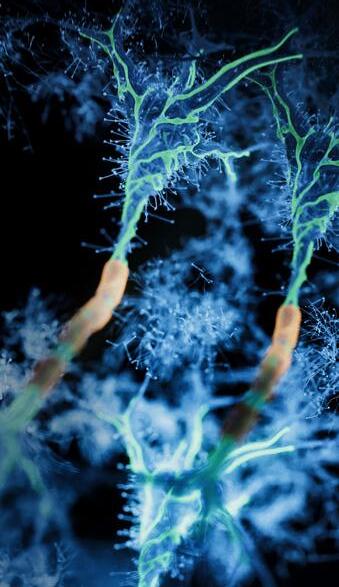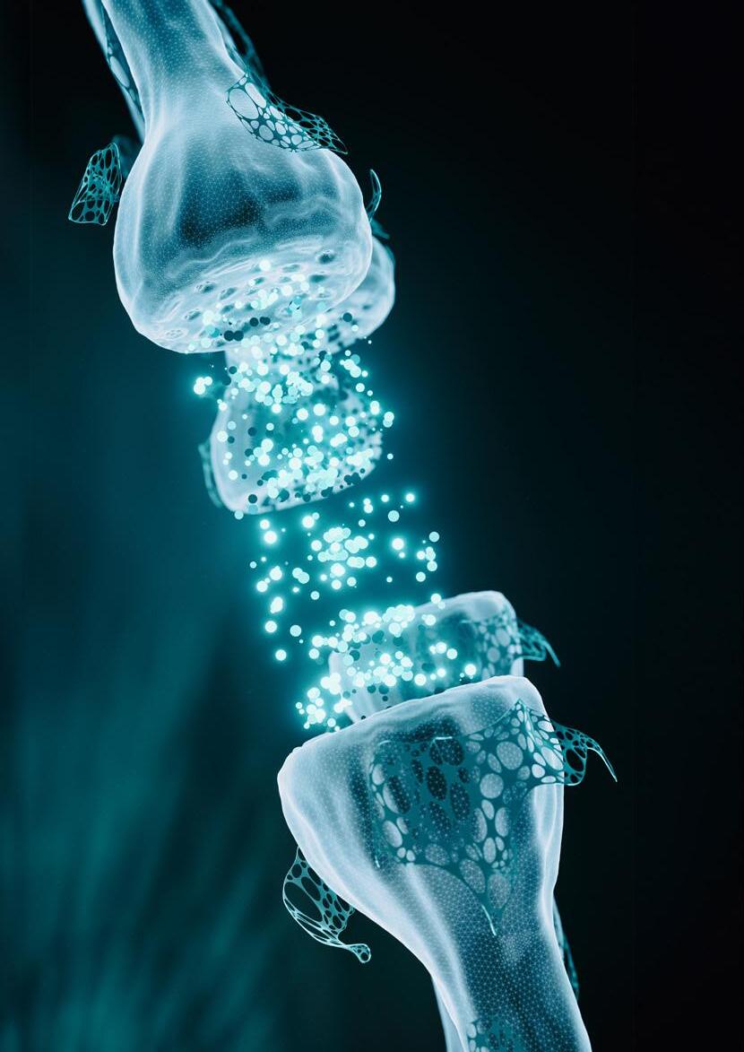 Synapsen sind die Stellen, an denen Nervenzellen über einen winzigen Spalt miteinander kommunizieren. Elektrische Signale entstehen, wenn wir etwas Neues lernen oder bewusst nachdenken – zum Beispiel, wenn wir überlegen, welche Farbkombination am besten passt. Chemische Botenstoffe überbrücken den Spalt und übertragen diese Signale.