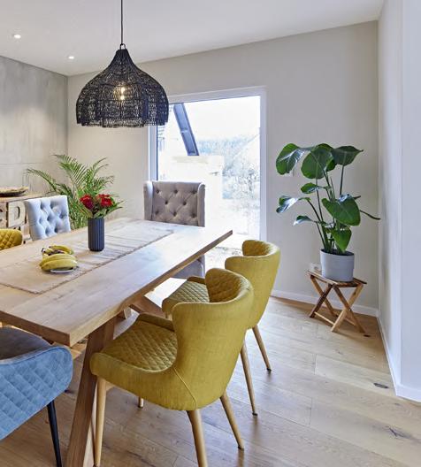 01 Essen mit Stil: Die Wand in Sichtbetonoptik (Sentimento 78) bildet einen spannenden Kontrast zum warmen Holzboden