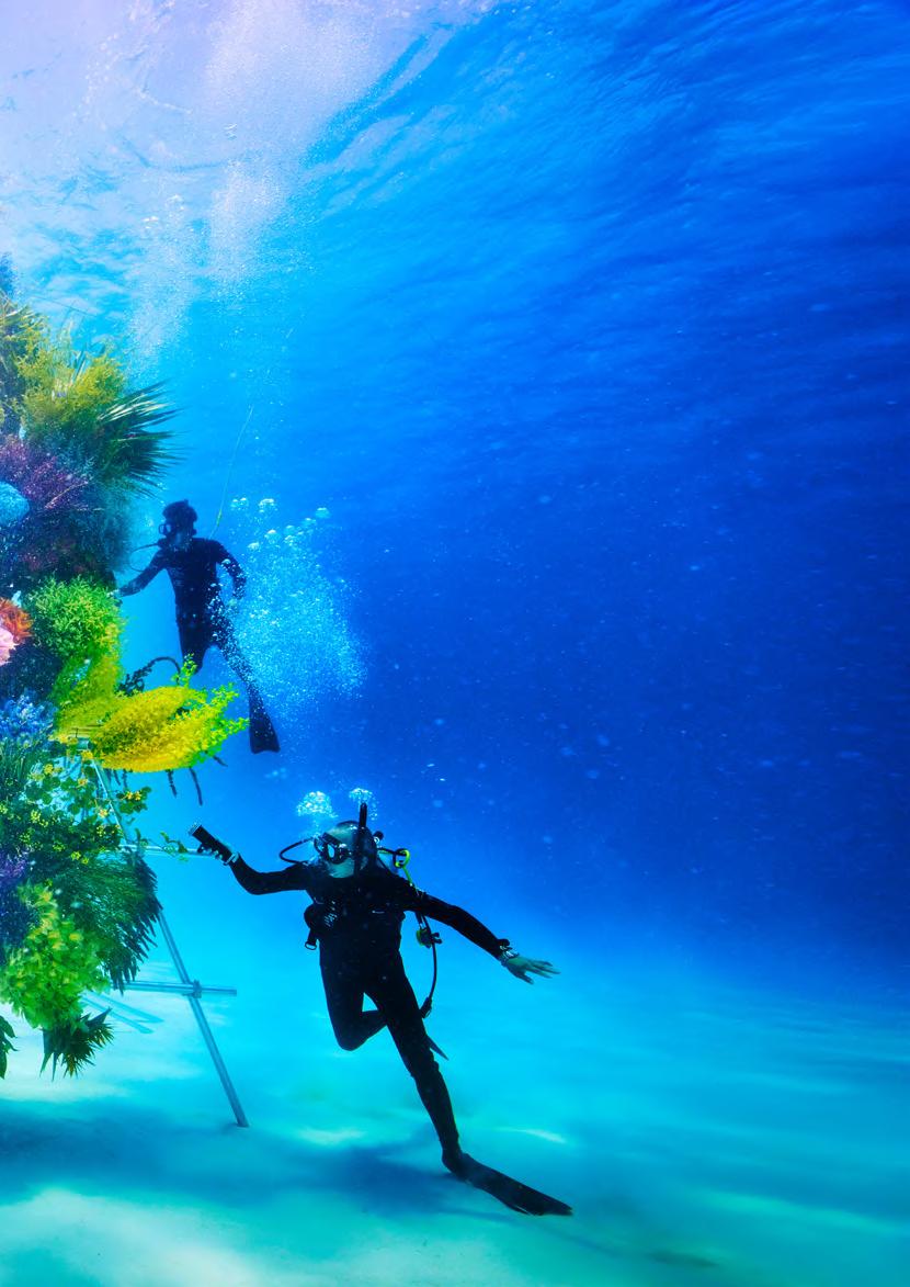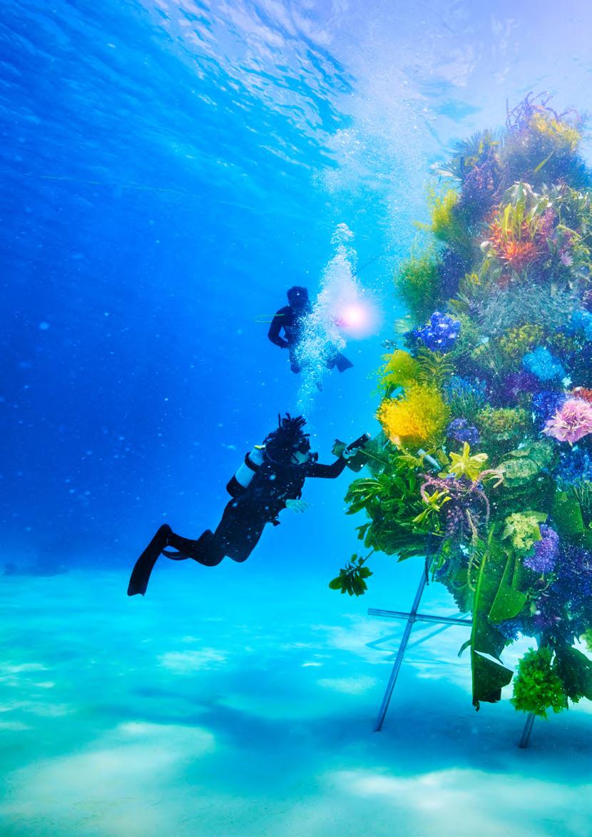 Wo würden Sie mit einem bunten Strauß Blumen rechnen ? Auf dem Esstisch einer Freundin, in der Hand eines Gastes ? Dank Azuma Makoto könnte uns auch unter Wasser oder im All mal ein Strauß begegnen. Der Japaner platziert Pflanzen an unkonventionellen Orten. Er hat schon Bonsai-Bäume in ein riesiges Terrarium und Sommergebinde in verschneite Landschaften gesetzt. Für die Installation „In Bloom project Sea #2“ auf diesem Foto schlüpfte er in einen Neoprenanzug und steckte echte Blüten auf dem Meeresgrund nahe der Insel Ishigaki, 200 Kilometer östlich von Taiwan, zu einem eindrucksvollen Bouquet zusammen.