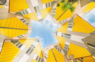 Nach oben offen Ein futuristisches Sonnensegel? Ein Stadion mit Guckloch? Nein, bei diesen sommersonnengelben Objekten handelt es sich um die Kubushäuser in Rotterdam. Jedes Haus ist einem Baum nachempfunden, mit Eingang und Treppenhaus im „Stamm“ und den Wohnungen in der gelben „Krone“ – ein architektonischer Geniestreich, erbaut in den 1980er-Jahren.