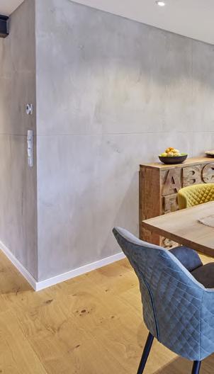 Statement mit Sichtbeton Einladend, aber modern sollte die Atmosphäre innen sein. Am auffälligsten löste Marcus Grimm die Aufgabe mit einem Sichtbeton-Statement auf einigen Wänden (Creativ Sentimento 78). Andere Wände wiederum bekamen mit Creativ Granulato 71 eine strukturierte Optik. Für das i-Tüpfelchen sorgten in Wohnzimmer, Treppenhaus und Bad die feinen Linienmuster der Besenstrichtechnik (Mineral-Leichtputz G 3679).
