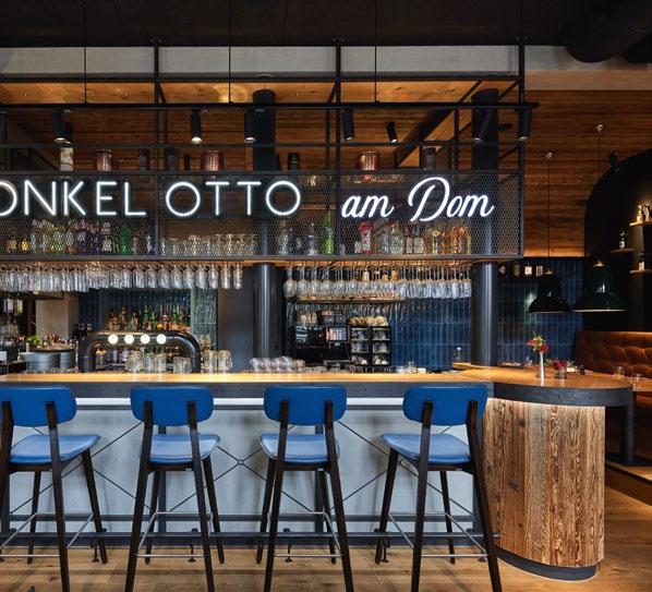 Region und 40 verschiedenen Biersorten –die historische Kneipenkultur wird bei „Onkel Otto“ hochgehalten. Doch Heimatverbundenheit heißt noch lange nicht, dass alles bleiben muss, wie es war: Bereits beim Betreten des Restaurants flackert den Gästen eine imposante zehn Quadratmeter große Feuerwand entgegen, an der das Geflügel am offenen Feuer zubereitet wird. Spektakulär ist hier alles: Draußen begrüßt ein zwei Meter großer Hahn auf einem Sockel die Besucher/-innen, drinnen gibt es an eigens für die Location angefertigen Tischen, den sogenannten BierOttos, kühle Blonde zum Selberzapfen.