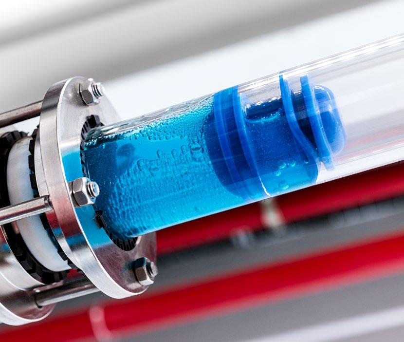 sich an die Rohrwände (s. Foto oben links) und reinigen sie so effizient. Treibmedium ist Wasser, das behandelt ist, um Bakterien abzutöten. So schiebt das Wasser den Molch an, der die Farbe Richtung Abfüllmaschine transportiert. Ist der Vorgang abgeschlossen, wird er mit Luft wieder zurückgedrückt. Das Molchen sorgt für eine sehr nachhaltige Produktion, da die hergestellten Materialien vollständig genutzt werden können. Es gibt fast keinen Materialverlust und Abfall.