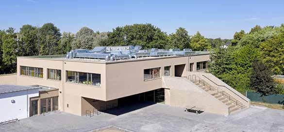 Die Bernhardschule in Auerberg ist eine der ältesten Schulen in der Bundesstadt Bonn. Als ganztägige Grundschule bietet sie Kindern der Klassen 1 bis 4 vielseitige Möglichkeiten zum Lernen, Wachsen und zur Entwicklung der individuellen Persönlichkeit. Von 2019 bis 2021 hat das Architekturbüro Fischer|Summerer aus dem rheinland-pfälzischen Andernach die Grundschule um einen zweigeschossigen Erweiterungsbau ergänzt. Dieser umfasst eine Küche mit angeschlossener Men sa, acht zusätzliche Klassenräume, vier Differenzierungsräume, zwei Räume speziell für den offenen Ganztagsunterricht (OGSRäume) sowie neue Sanitärbereiche. Auf dem Schulgelände entstand so ein moderner Neubau für etwa 400 Grundschüler, der zugleich mit dem Bestandsbau interagiert und einen Bezug zur städtischen Umgebung erkennen lässt.
