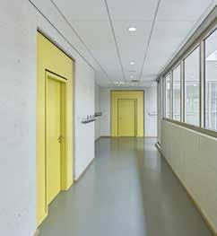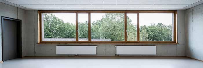 J. Fischer: Der Raum stellt für uns den Rahmen dar. In der Re gel ist es so, dass, wenn eine Schule den Betrieb aufnimmt, die Kinder vor Ort diese mit eigenen Kunstwerken schmücken, wo durch zusätzliche Farbigkeit in den Räumen entsteht. Dann ist es eher wohltuend, wenn der Rest zurücktritt. Dennoch haben wir mit Farbe gearbeitet: farbiger Kautschukbelag, farbige Türen und Türelemente sowie farbige Fliesen in den Sanitärräumen. Das setzt Akzente, ohne überladen zu wirken. Bei der Decke und einzelnen Wänden haben wir hingegen mit einer Kombination aus Rasterdecke und Vlies gearbeitet. Die großen Vliesplatten sind nicht ganz weiß, sondern leicht gelblich, was wiederum eine schöne dezente Farbigkeit integriert.
