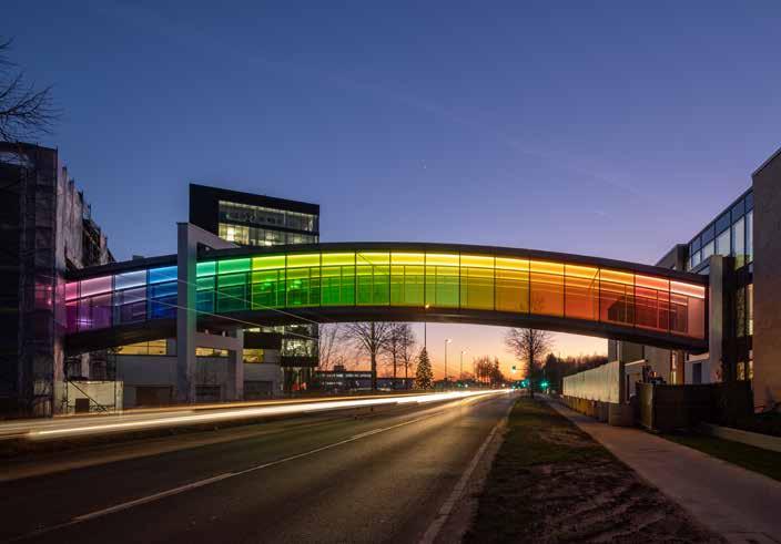 Das Projekt B-Wohnen zeigt ein weiteres Beispiel dafür, wie Sonderlösungen überzeugend umgesetzt werden können, wenn alle Beteiligten an einem Strang ziehen und auch unkonventionelle Lösungen gemeinsam hinterfragen. Da bei diesem Projekt eine Erschließung über das benachbarte Wohngebiet nicht infrage kam, verbindet nun eine außergewöhn liche, in Regenbogenfarben verglaste Brücke die Gästezimmer und Apartments des Gästehauses B-Wohnen mit dem Brillux Werk auf der gegenüber liegenden Straßenseite. Dort finden alle Schulungs einheiten der Brillux Akademie statt.