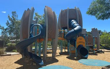 Set amongst established trees, the playground at John Bray Park embraces a charming scribbly gum theme. The standout feature has to be the large play tower where children can test their balance on the wobbly net bridge, zoom down the slides, and explore the elevated structure. There’s also a sweet little nook at the end of the tower that has been designed specifically for toddlers.