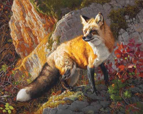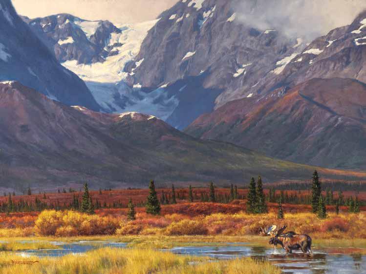 show is Don Oelze, who will be showing Camp at the Trading Post , a large winter scene with numerous figures and a majestic landscape in the background. “ Camp at the Trading Post is about those in-between moments when people stop long enough to rest, trade, talk and simply be,” he says. “This painting is a bit different from what I usually do, with a greater emphasis on the landscape and smaller figures. I wanted to show not only the activity of a busy camp, but also the immense setting and atmosphere that surrounds it.”