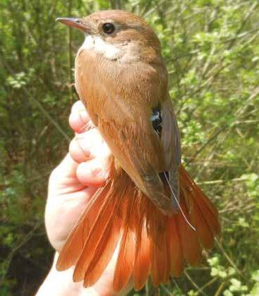 calendar to track bird movements over long distances, providing valuable information about their migratory journey between England and their West African wintering grounds. However, in order to retrieve the information from the geolocators, the Nightingales needed to be recaptured and the devices removed – no easy task for a bird most at home in dense scrub! Of the 20 geolocators fitted to birds across Britain, 13 were retrieved, including two at Grafham Water, and sent to BTO HQ for analysis. Having successfully trialled the technology, a further research project for 2015‒20 is using more sophisticated GPS tags, weighing 0.9 g, on some birds, as well as geolocators on others, to gather additional data. This is the first time that these tags have been used on a small, long-distance migrant bird and, by using the GPS network of satellites, we will be able to get very accurate point data (down to a few metres!) at each stage of the birds’ migration. In 2016, two birds caught at Grafham Water were fitted with GPS tags and another bird was caught with a geolocator already fitted, which was removed for analysis.