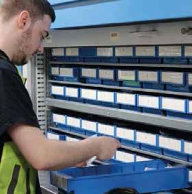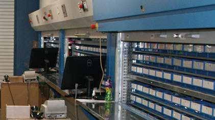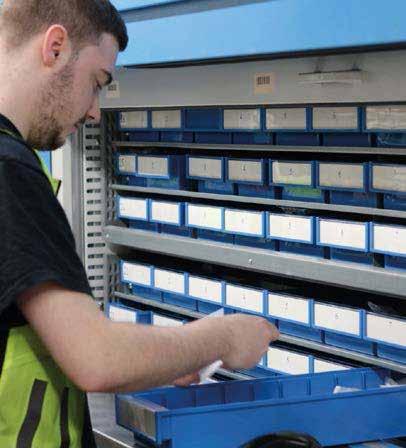 Small/medium parts are retrieved via automated carousels/lifts, while larger inventory is picked from static racking using iPad scanning for accuracy.