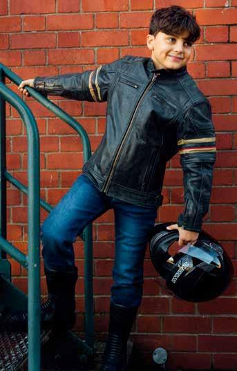 Offering authentic retro style with adult-grade safety, this premium leather jacket is AAcertified, with CE-approved armour at the shoulders, elbows, and back. To accommodate growing riders, it has a 3cm zipped sleeve extension. Available to fit ages 6-14 (RRP £179.99).