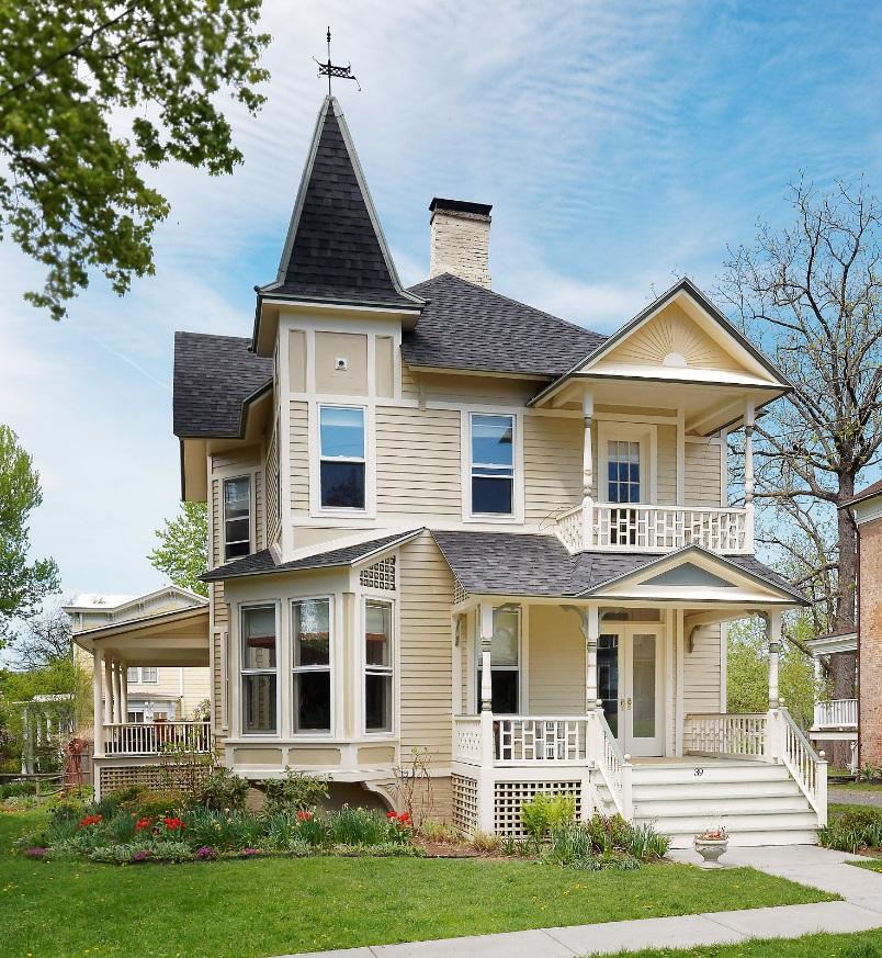 The south building was built in 1848 and used as a church. The north building was once a cigar factory and later used as a printing company.