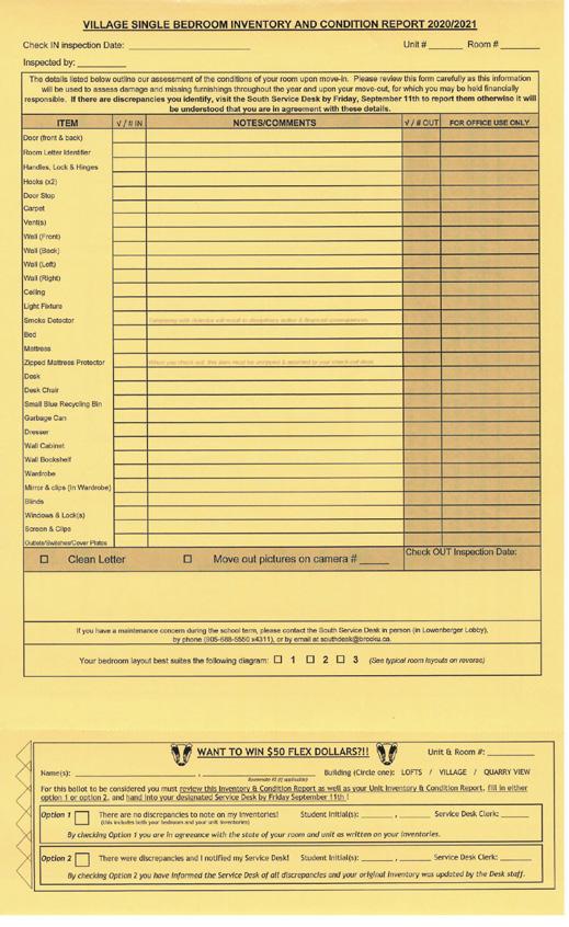 **Upon checking in, you will find yellow carbon copies of your unit, room, and washroom inventory and condition reports. You should review these carefully, as the information will be used to assess damage and missing items upon your move-out, for which you could be financially responsible. Any discrepancies must be reported to your Service Desk (preferably by email) before 4:30 p.m. on Sept. 5th. Once you’ve reviewed the report, hand in the bottom portion for a chance to win $50 in Flex Dollars. Be sure to hand it in even if you don’t have any changes to report!