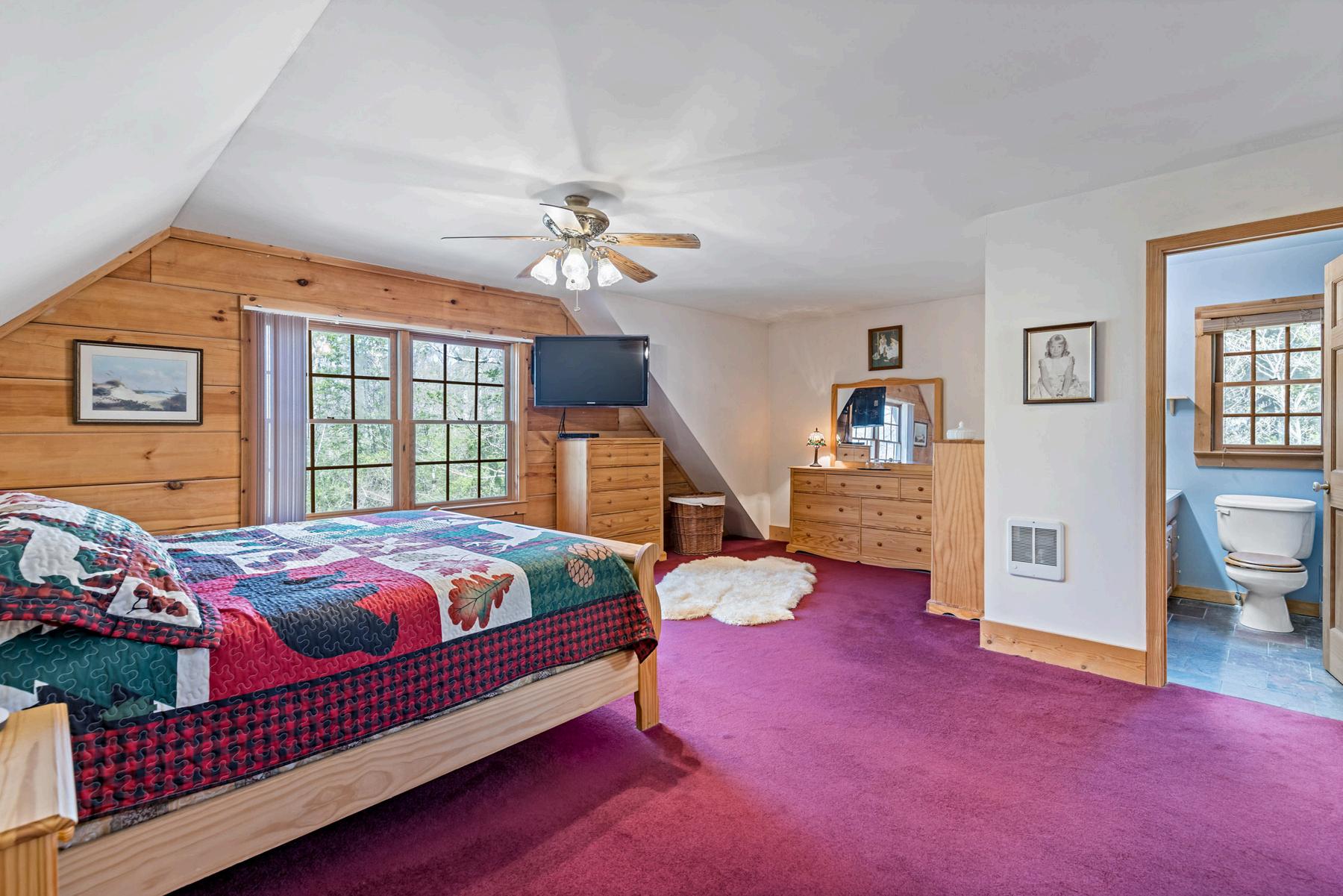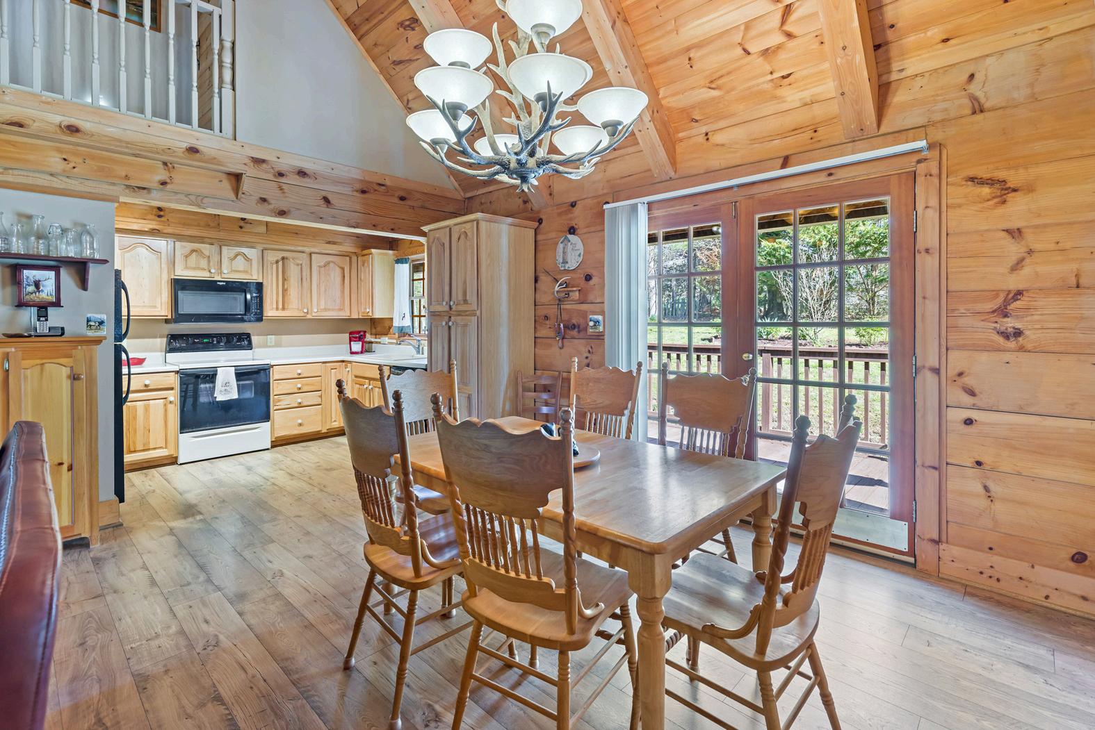 Inside, cathedral ceilings soar above the open living area, where a crackling fire in the potbelly stove provides warmth and ambiance during colder seasons.