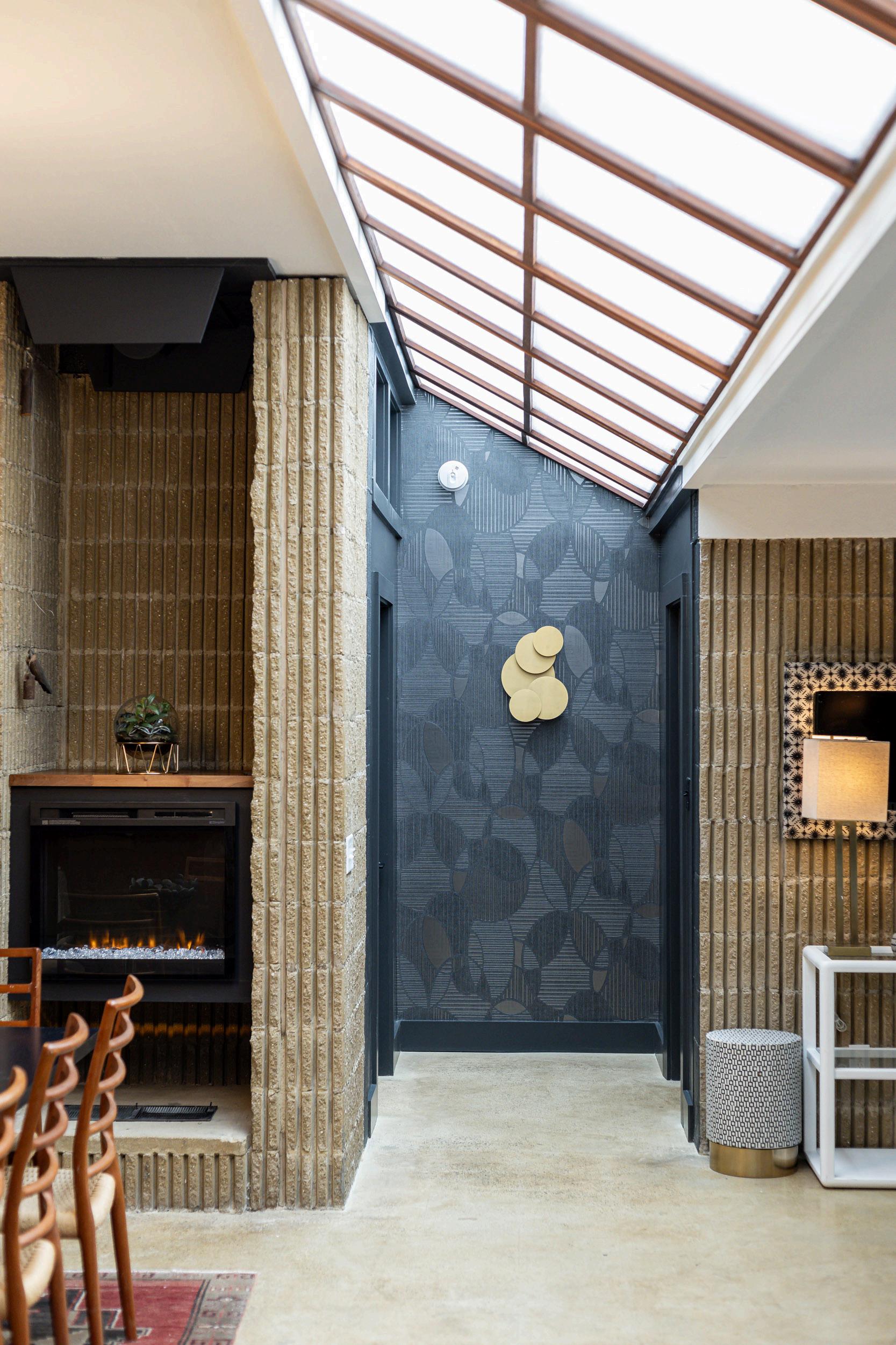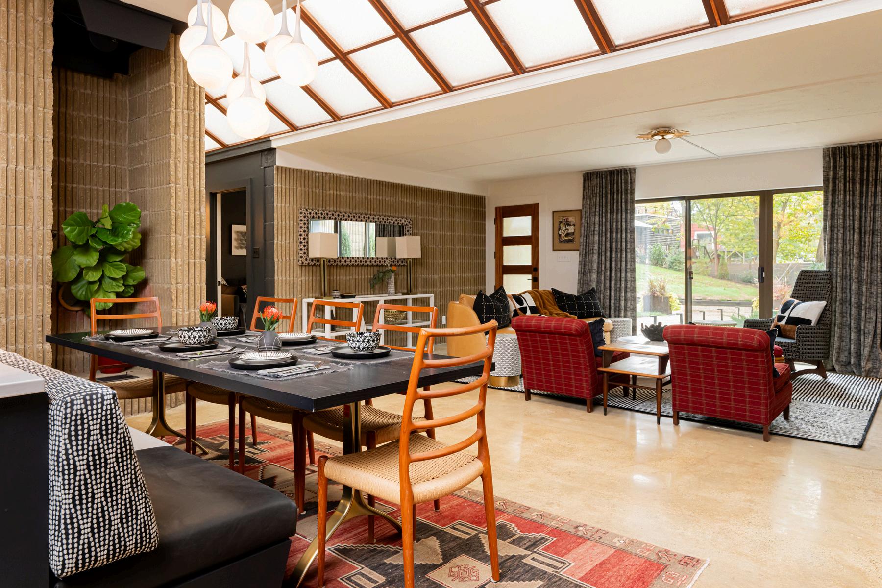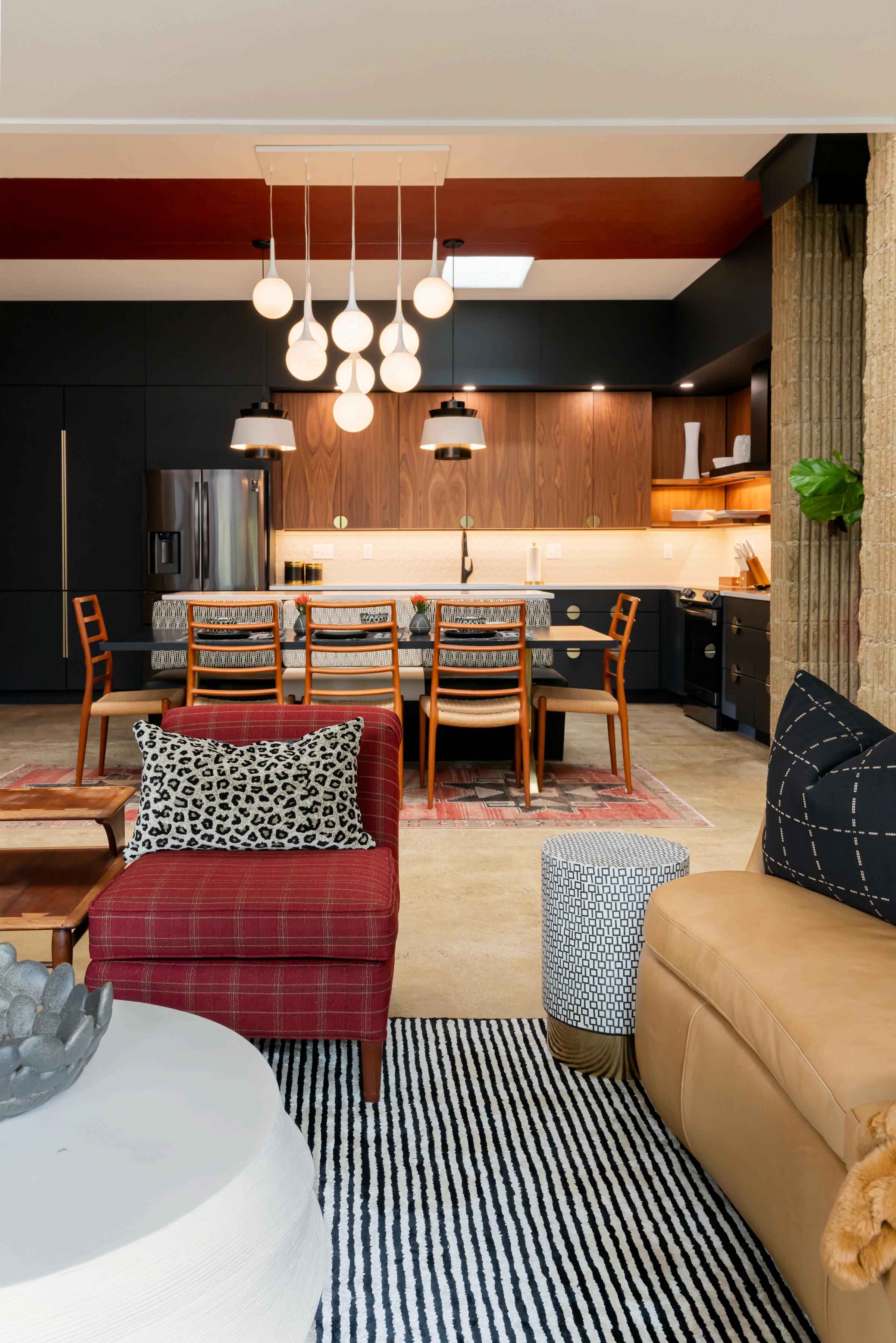 Step into a living space that exudes hip, chic vibes. The open floor plan allows for seamless flow, perfect for both relaxation and entertaining. Natural light floods the area through the extensive skylight, highlighting the stylish decor and modern finishes. The moody mid-century aesthetic creates a cozy and inviting ambiance.