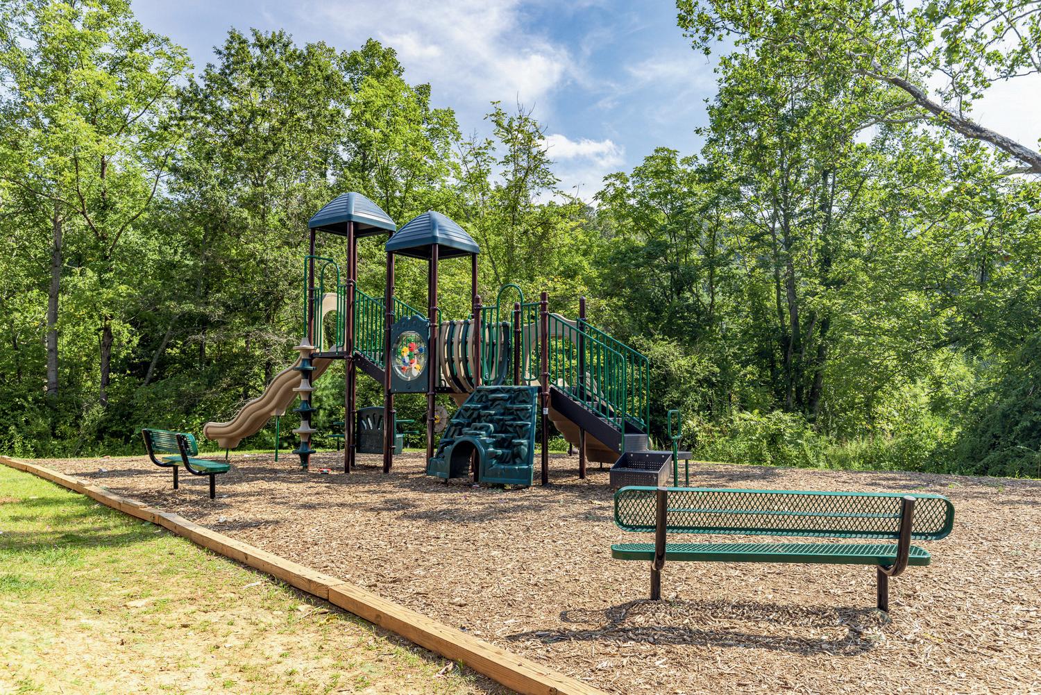 Outdoor amenities include walking trails, a playground, and a grill/fire pit area. Some units even feature a private sandy beach with a fire pit on the bank of a running creek, providing a serene outdoor retreat.