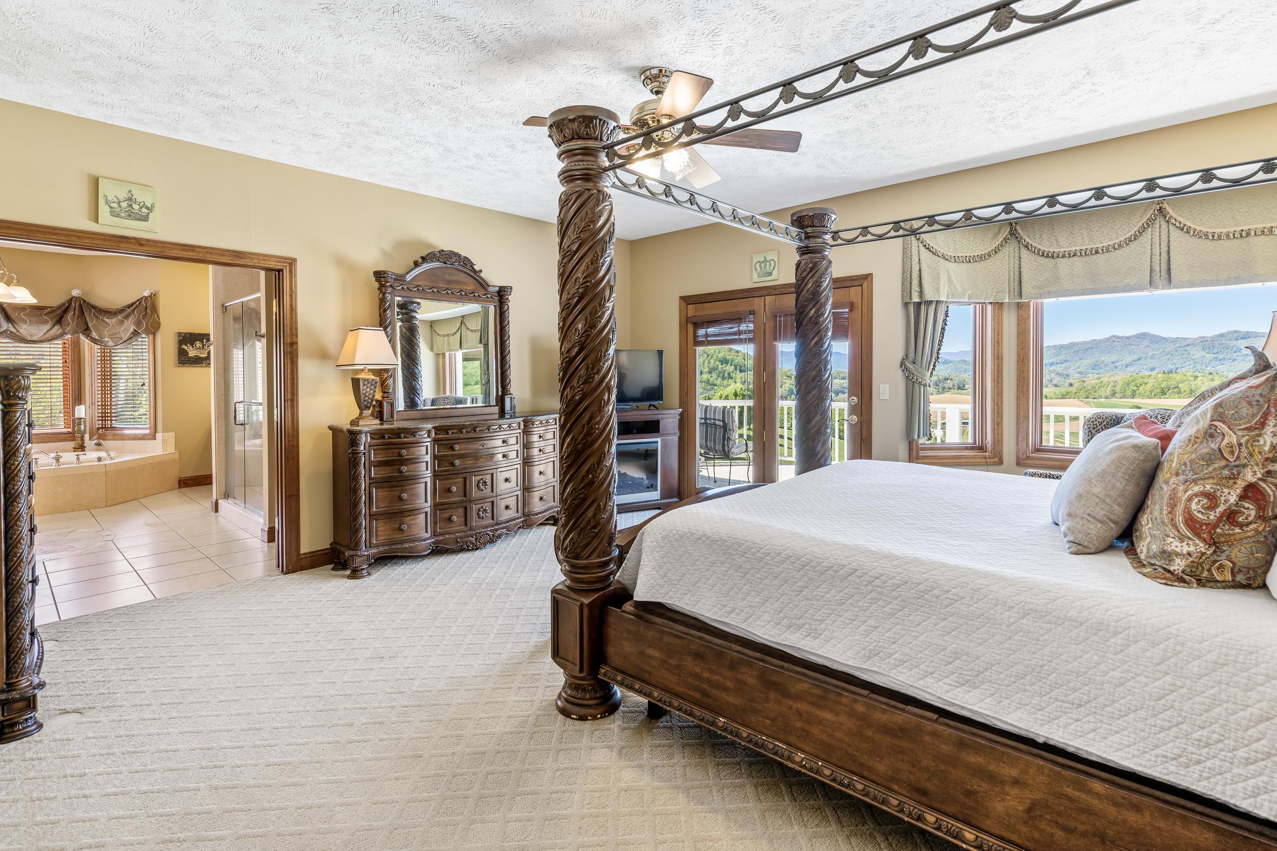 The master bedroom offers a king bed, 44" TV, private balcony, and en-suite with a walk-in shower, double vanity, and jetted tub.