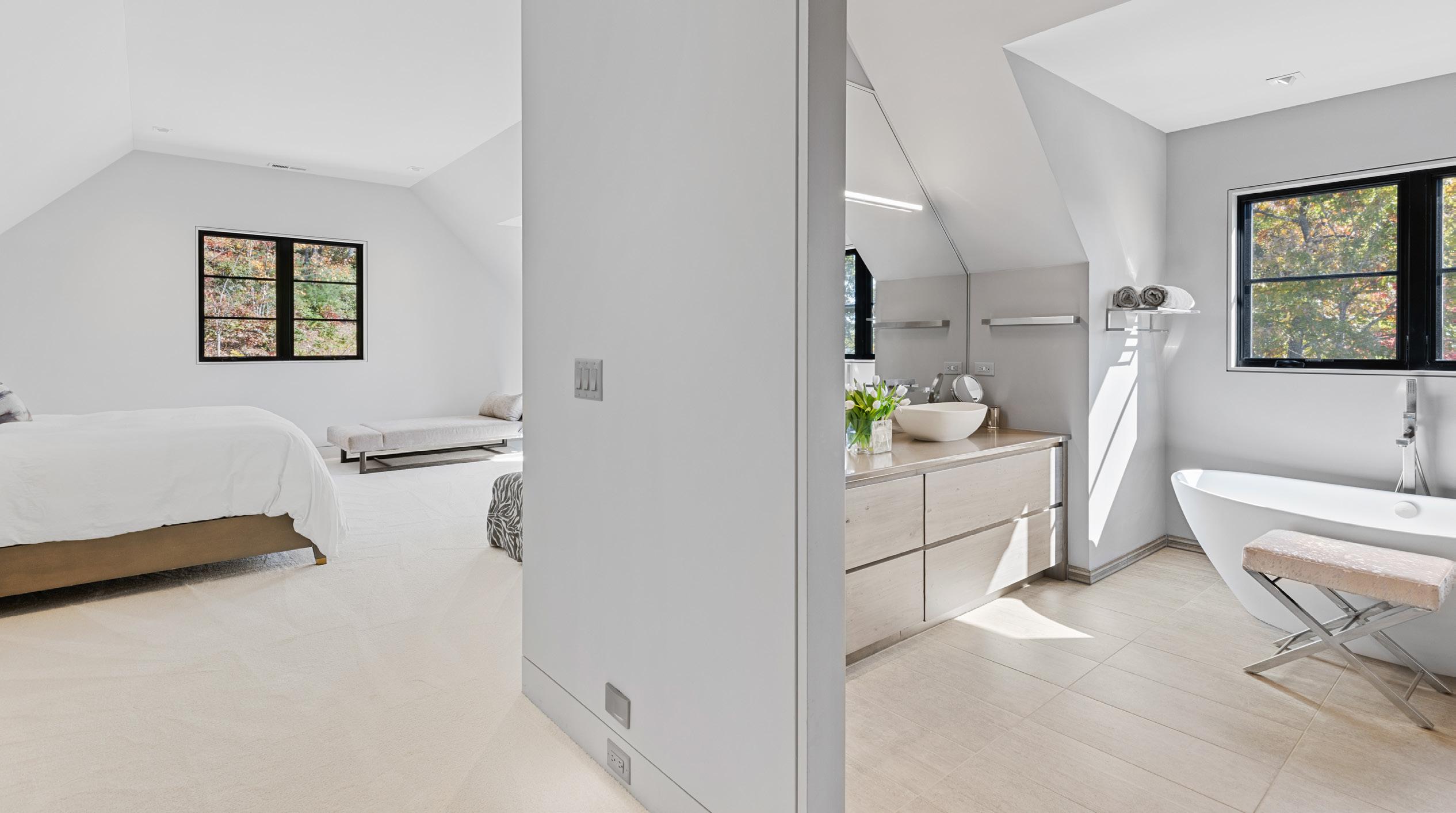 The second primary suite offers a separate wing upstairs with many amenities all tucked behind its own door for additional privacy. The spa-like en suite bathroom offers a garden soaking bath in addition to a large shower and double vanity.