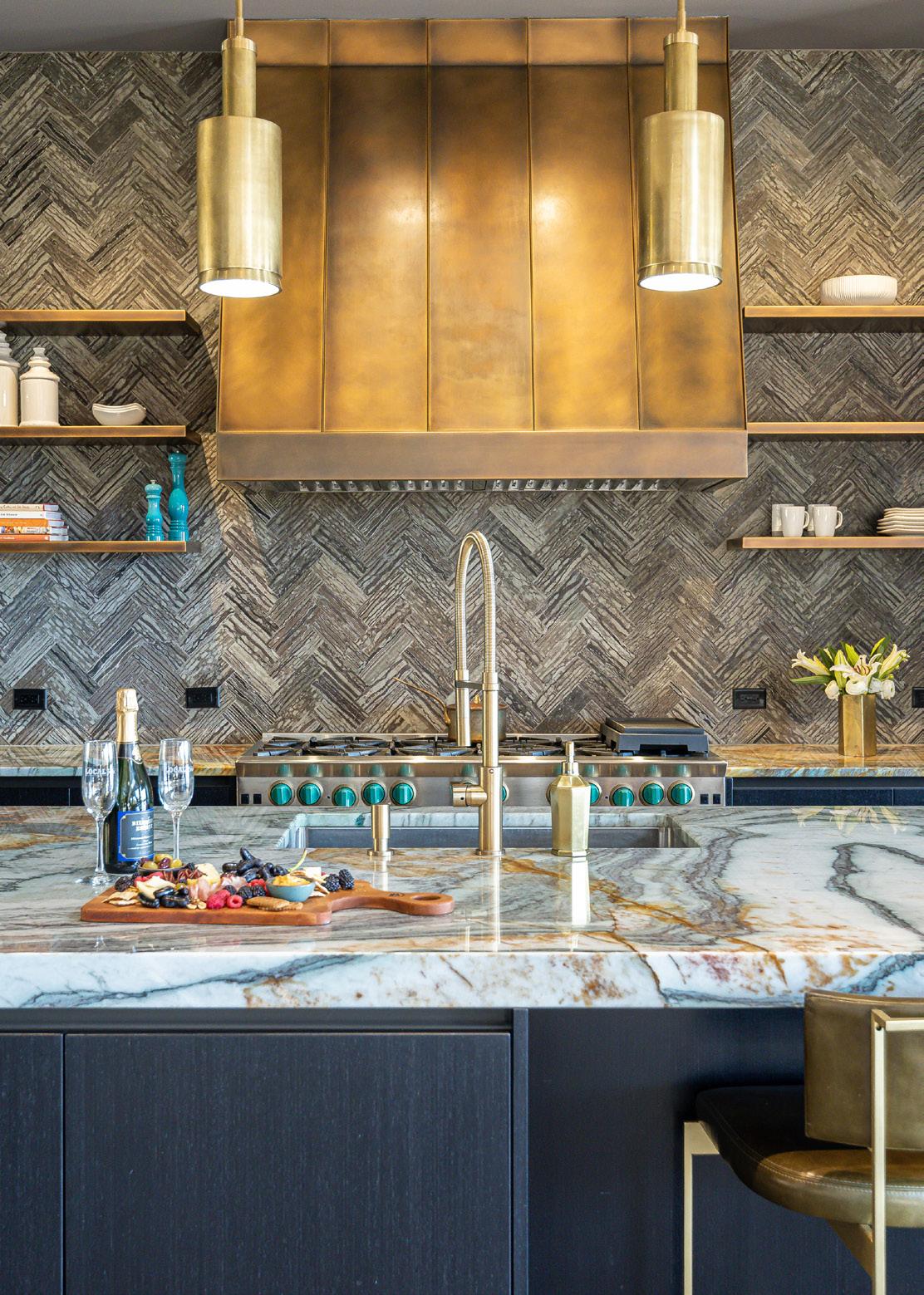 Renowned interior designer Ronal Fenstermacher (R.F.I.) mixed textures throughout the house making it edgy, yet warm. The kitchen’s design embodies this from the double waterfall statement island made of Brazilian “Val d’Orcia” quartzite, brass range hood, fixtures, pendant and seating, and Turquoise Bluestar Range.