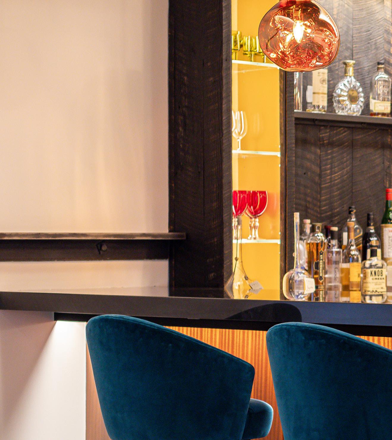 The full service bar glows with gallery lighting and glass pendant lights. Multiple seating options between barstools, custom banquette seating, and sexy green lucite chairs in the nook that has Gilded Robber Barons’ limited edition wallpaper. The powder bathroom is off of the billiard room.