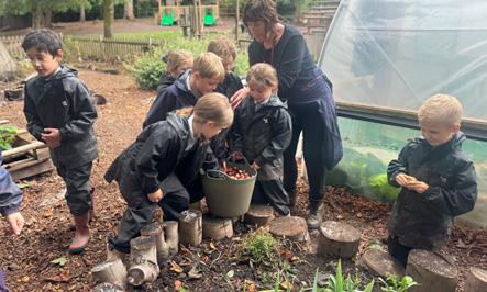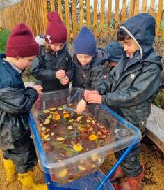 Physical development and teamwork were central themes. Children transported soil in wheelbarrows, balanced on planks, played skittles, and explored sensory water play. At Forest School, they rolled conkers, dug for minibeasts, and built animal homes, strengthening both gross and fine motor skills. Rainy sessions became joyful adventures as children embraced muddy play, demonstrating resilience and delight in all weathers.