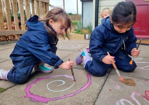 As Autumn deepened, learning burst with colour and creativity. Children collected acorns, conkers, and sycamore seeds on wellie walks, compared textures and shapes, and experimented with mixing colours to make orange. In the mud kitchen, they mashed apples and invented imaginative “Autumn recipes.”