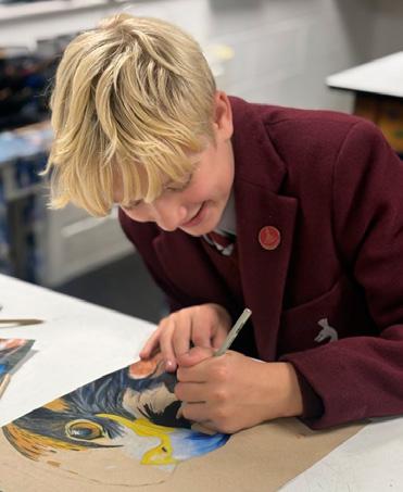 striking collages influenced by Yayoi Kusama, and Year 6 focused on expressive oil pastel coral compositions. Year 7 experimented with lino printmaking, and Year 8 completed hyper-realistic animal portraits using Prismacolors. Beyond lessons, Art Scholarship Pathway pupils took part in a clay workshop led by The Great Pottery Throwdown ceramicist Stephen Parkes, and every pupil contributed a Christmas card design to raise funds for CAFOD.