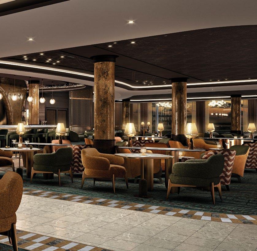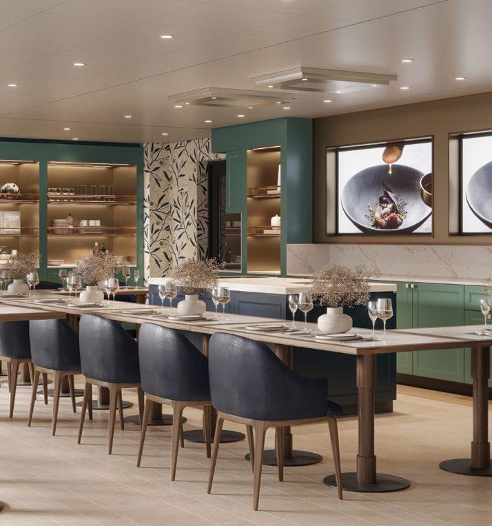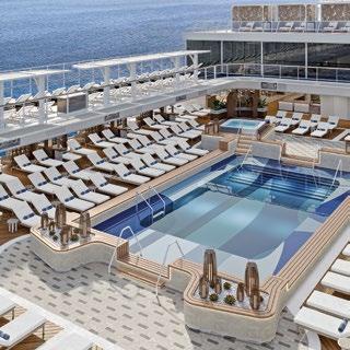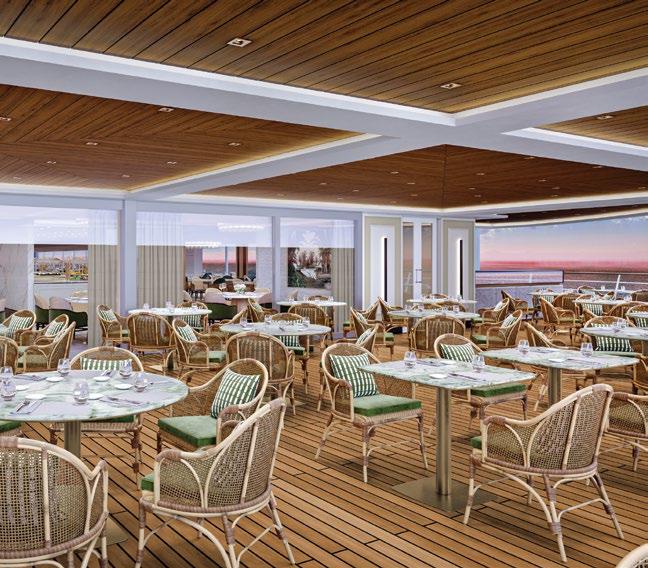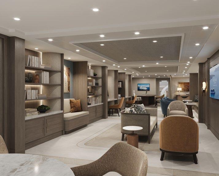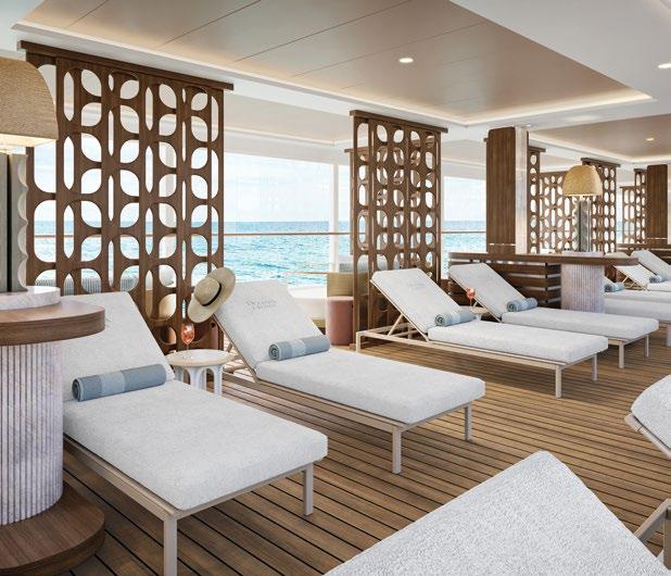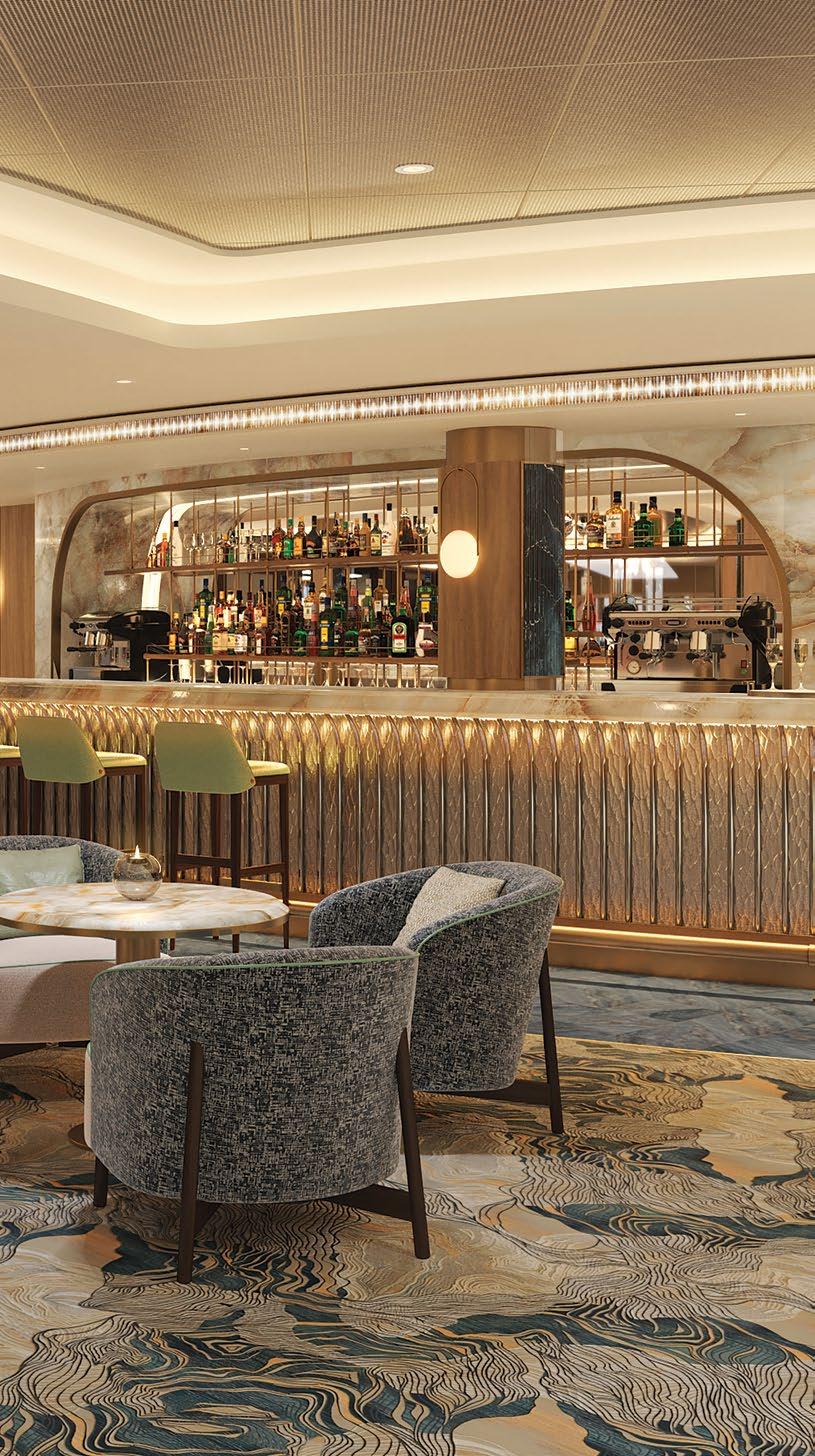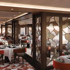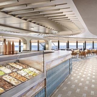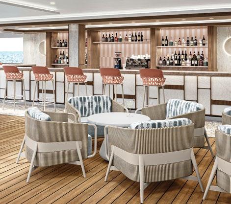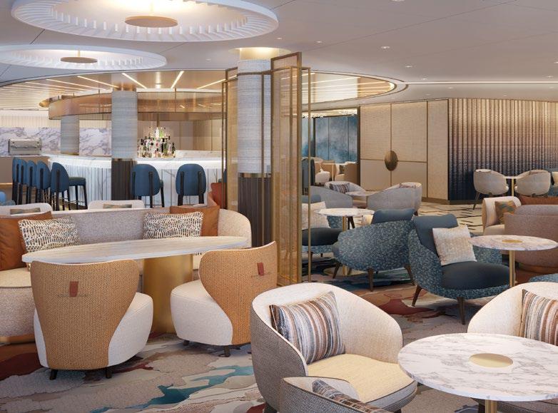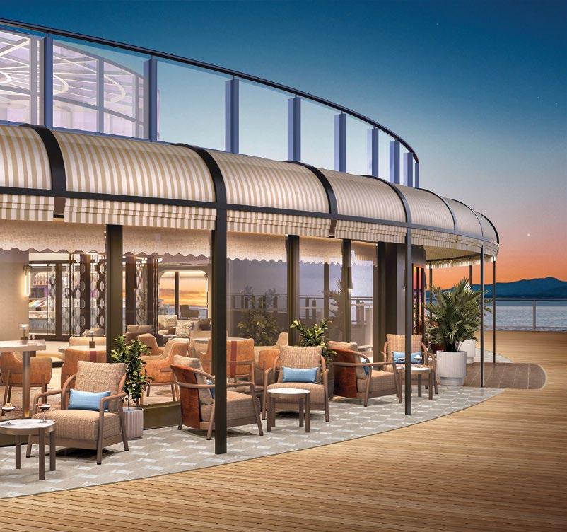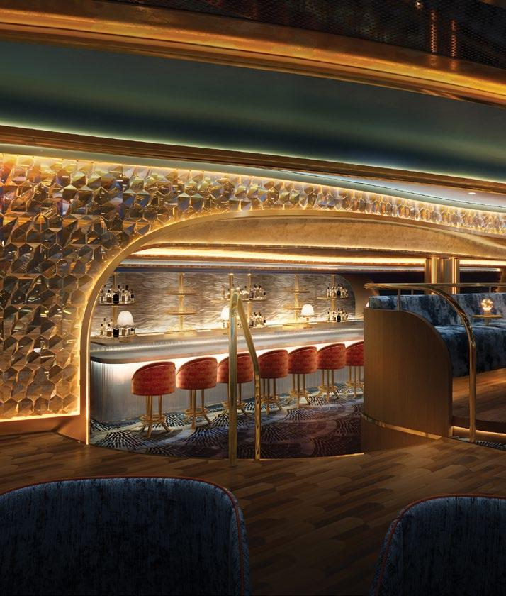 The most distinctive feature of aptly named Horizons is the lounge’s dramatic floor-toceiling windows, offering 180 degrees of stunning vistas. This space celebrates the journey by providing a unique perspective on the alluring destinations that await ashore and the seas that carry you to what lies ahead.