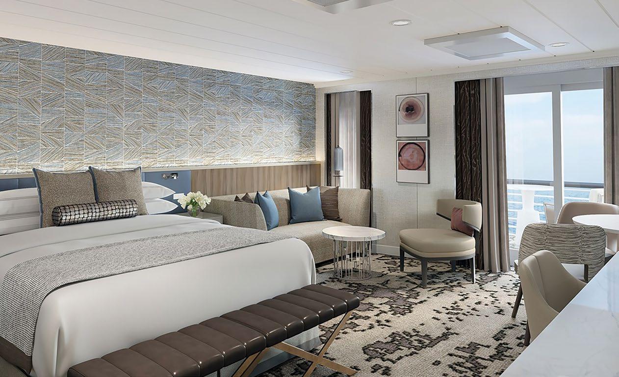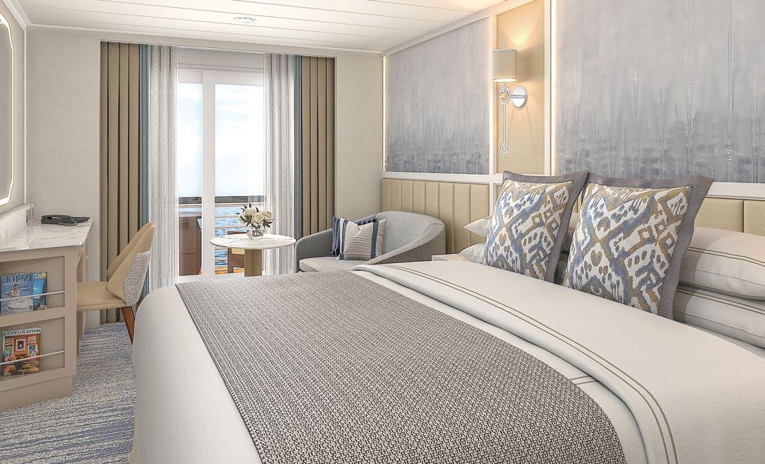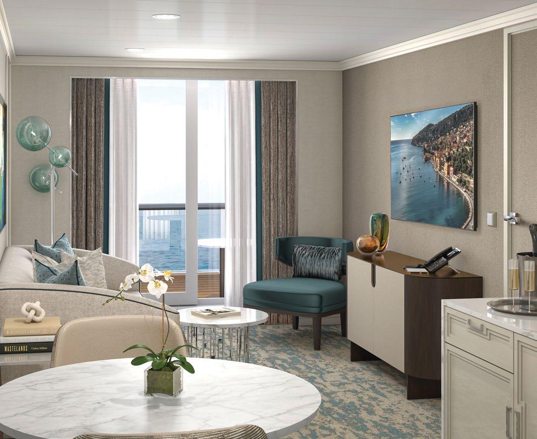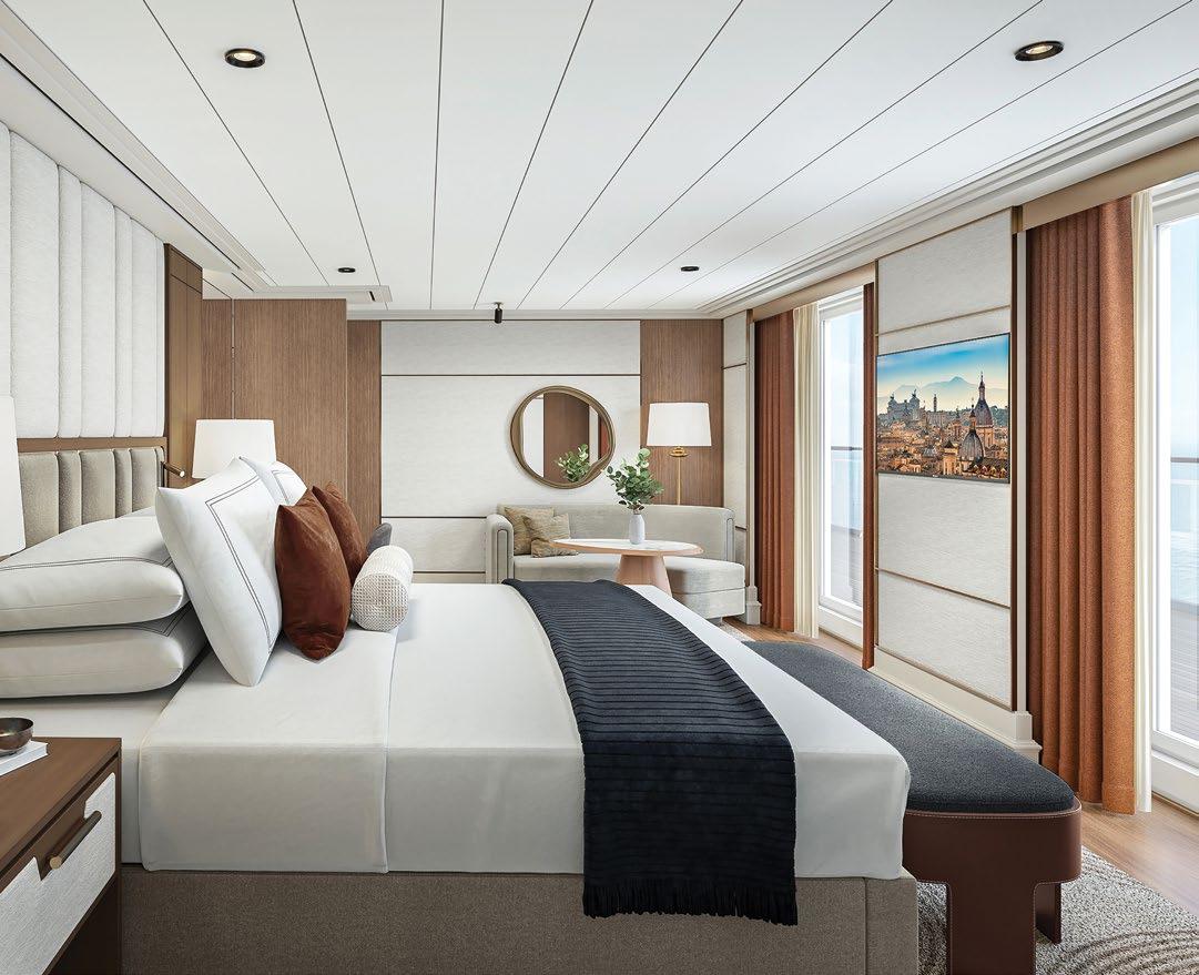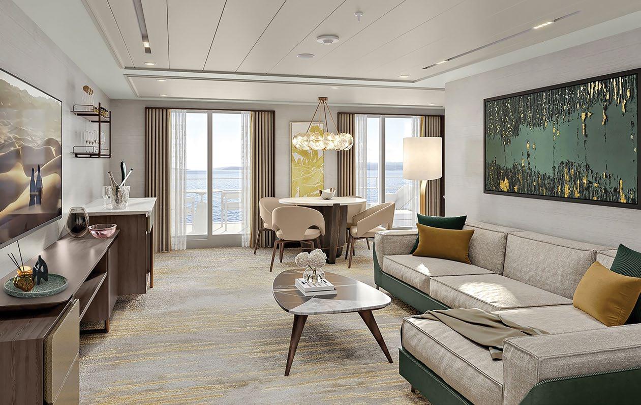 SUMMER 2025: Ship’s capacity is finalized at 1,390 guests. Owner’s Suites expanded to two bedrooms. Two new categories of suites added.