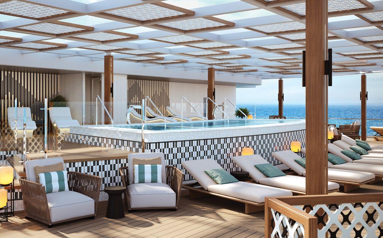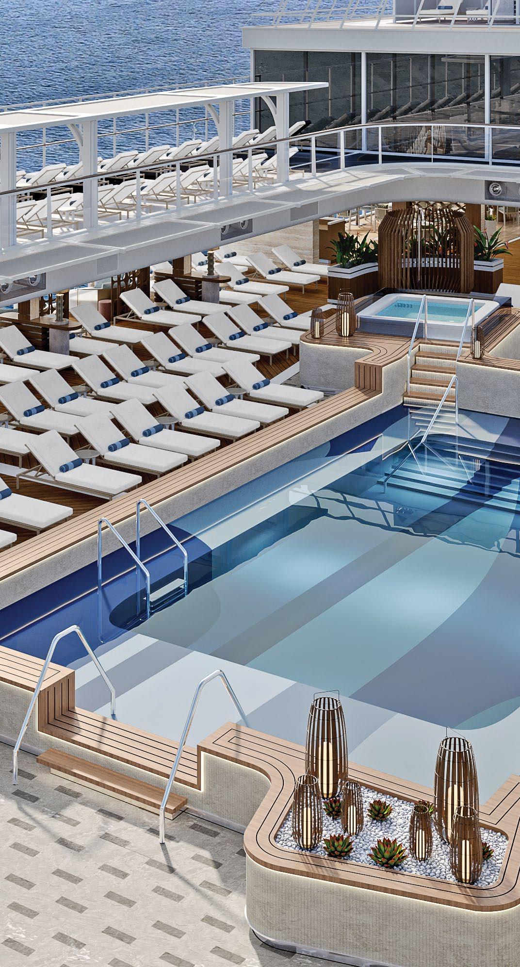 The Pool Deck reflects the beauty of the surrounding sea. Taking its cue from natural environments that inspire tranquility, the design brings together organic textures and calming tones to create an idyllic onboard escape that connects you to the sea. Relax in the luxury of a shaded cabana and admire the stunning vistas, or lounge by the poolside Waves Bar, imbibing in a tall, cool libation.
