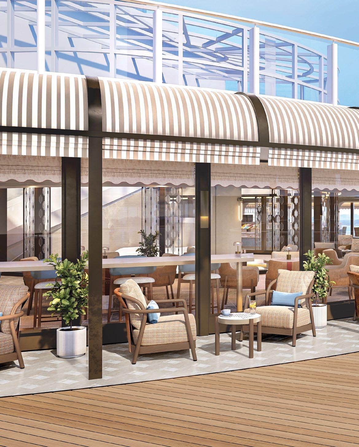 To best pair the luxurious experience of savoring a cup of coffee with memorable views, they relocated Baristas to the top of the ship, an ambitious move that required reworking Oceania Sonata’s steel structure. But the payoff was worthwhile: The new coffee bar will offer 270-degree panoramic views and quadruple the size it has on Oceania Vista. “It’s absolutely the most magnificent space on the ship,” Dahlgren says. The former atrium spot won’t go to waste, either. It will be transformed into a chic cocktail lounge, perfect for pre- or postdinner drinks.