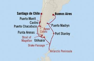 Estero, Aysen & Strait of Magellan – specific fjords are subject to change. Other fjords will also be viewed. Pre-cruise overnight hotel stay required (not included).