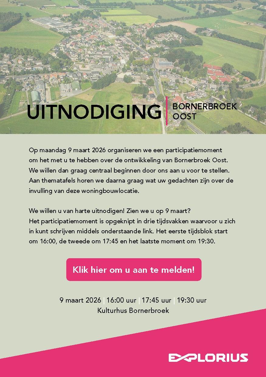 De werkgroep Bornerbroek Oost is gestart om mee te denken over de toekomstige ontwikkeling van Bornerbroek Oost. We willen dat dit plan maximaal aansluit bij de woonbehoefte van Bornerbroek, de leefbaarheid van het dorp versterkt en het dorpse karakter behouden blijft.